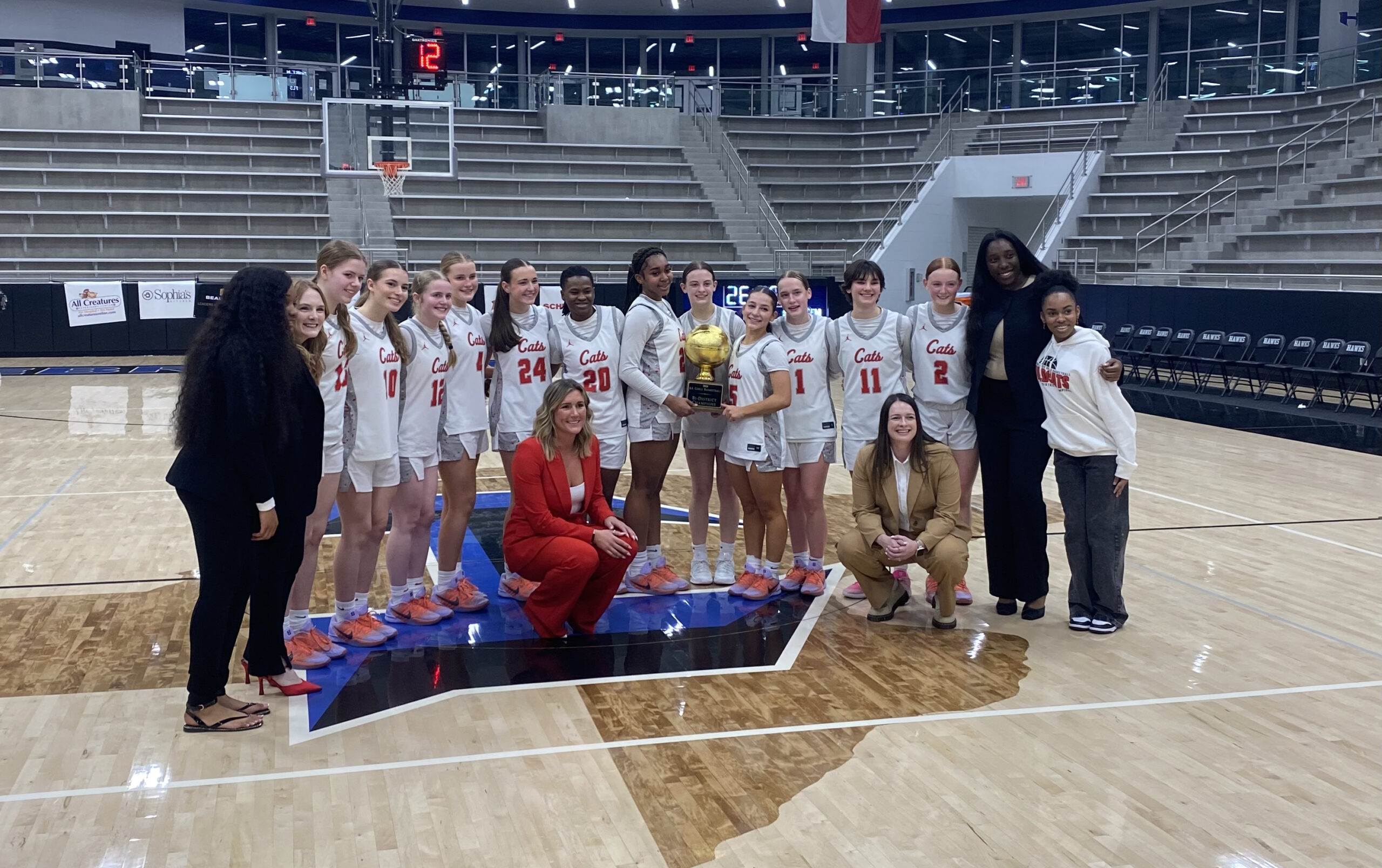Lake Highlands women’s basketball poses following a 30-28 victory over Arlington Martin in the bi-district round at Hebron High School on February 17, 2026. Photo by James Baxley-Cross